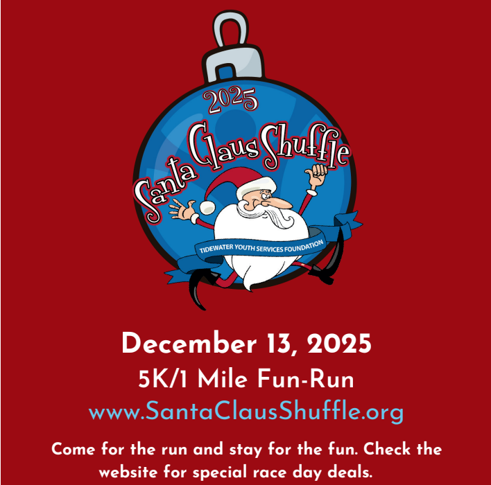 The Santa Claus Shuffle supports the efforts of the Tidewater Youth Services Foundation. The foundation provides at-risk and court-involved youth “quality of life” needs and experiences. That could be appropriate clothing for a job interview or a chance to go bowling with their peers.