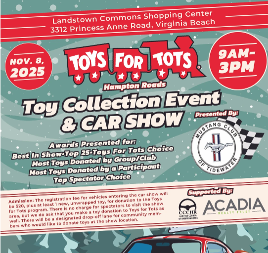 The Mustang Club of Tidewater is holding their second Marine Corps Reserve Toys for Tots Hampton Roads Official Toy Collection Day and Mustang Club of Tidewater All Makes and Models Car Show!! This show is to support the Toys for Tots Hampton Roads program as they ramp up for Christmas, 2025. The car show is open to the public, so bring your favorite car, truck, or bike/trike and your donations of new, unwrapped toys for boys and girls in the Hampton Roads area. Toys for Tots Toy Collection from 9:00am until 2:30 pm. Car Show from 10:00a.m until 3:00p.m.