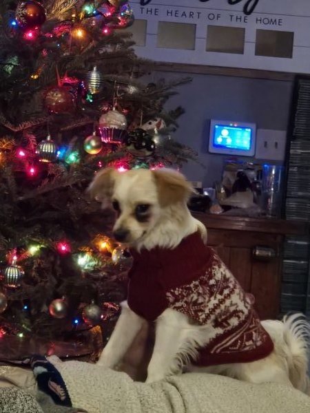 Ozzy (named after Ozzy Osbourne of course) is 9 months old. He is a wild spunky long haired Chiwoxy. Which is a Chihuahua Fox Terrier mixed. He has SO much energy and we love him so much! We hope you love him as well in his Christmas Sweater. He loves to be dressed up!
