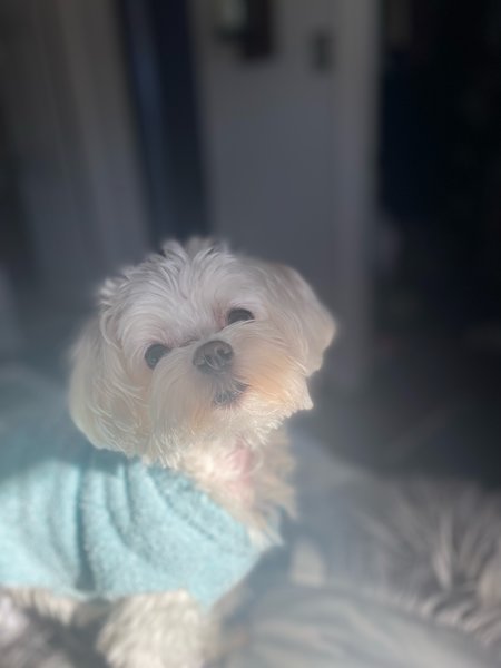 Penelope is a spoiled rotten 9 year old miniature Maltese. Her favorite things are going bye-bye (car ride), going for walks and laying in warm laundry just out of the dryer. She also hangs out at the refrigerator hoping someone will give her a piece of lettuce.