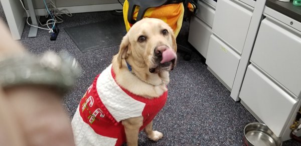 | This is our first year without my beloved Lynx. Lynx was a certified Guide Dogs for the Blind who went to work with me everyday for seven years. This picture was our last Christmas before he was diagnosed with cancer in July 2022. He loved Christmas and tolerated me putting this sweater on him every year. |